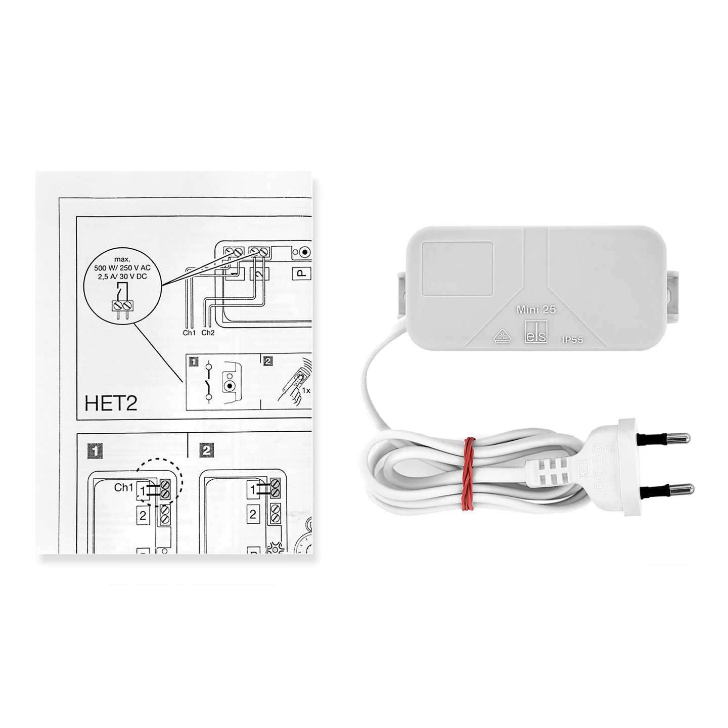 Das Besondere: Der Empfänger ist als Nachrüstsatz kostengünstig. Das Gehäuse des HET2 2-Kanal-Empfängers im Miniformat ist separat gefertigt und besteht aus einem robusten Kunststoff. Der Empfänger ist mit zwei potentialfreien Ausgängen versehen und unterliegt der Schutzart IP 44. Er ist steckerfertig und funktioniert unabhängig von der Stromversorgung des Antriebes. Eine zusätzliche Steckdose im Installationsbereich ist daher erforderlich.