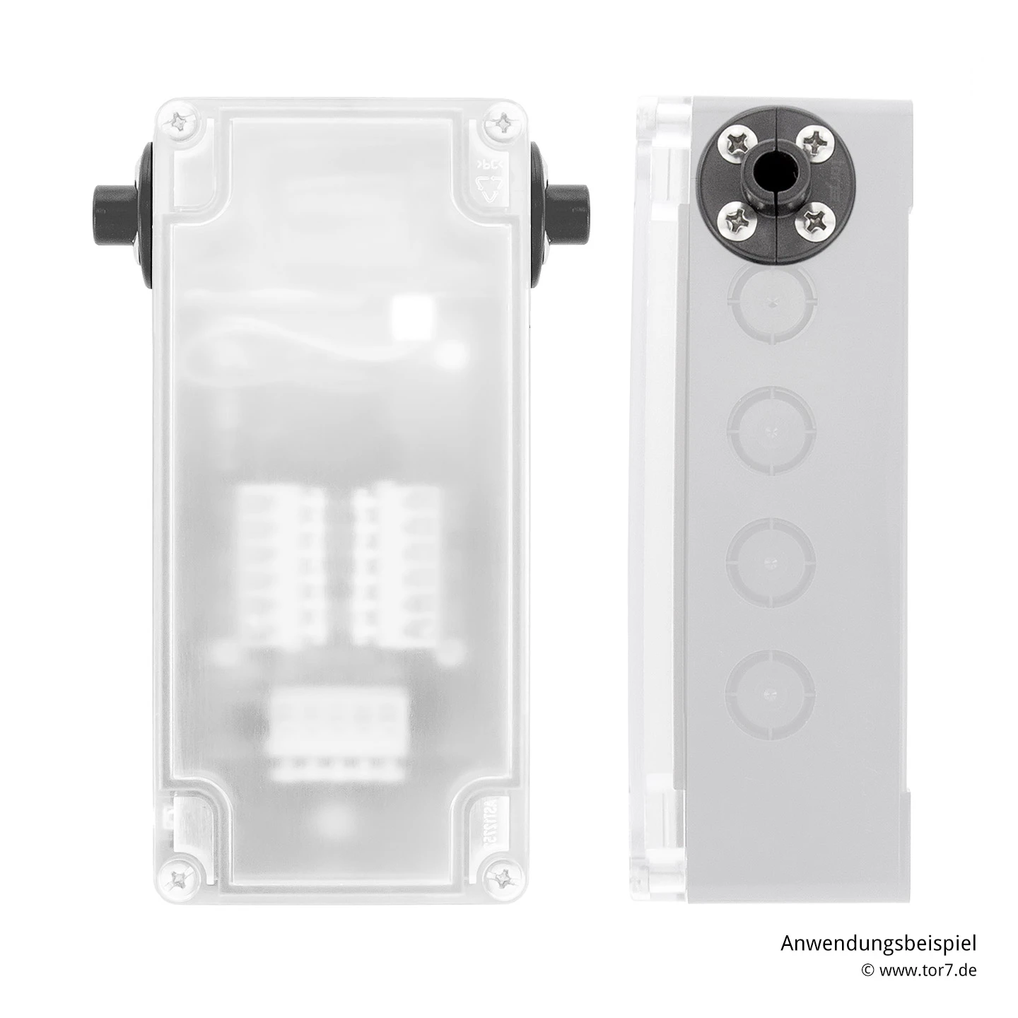 Da es sich bei allen um elektronische Bauteile handelt, müssen diese ausreichend vor von außen eindringender Feuchtigkeit geschützt werden. Während die Sicherheitskontaktleisten innerhalb von speziellen Gummiprofilen untergebracht sind, befindet sich die stationäre Hauptplatine innerhalb eines witterungsresistenten Norm-Gehäuses. Durch dieses SKS-Gehäuse wird allerdings auch das am Tor montierte Zugseil gezogen, sodass dessen Ein- und Ausgänge ebenfalls entsprechend dicht sein müssen. Hierfür kommen dann die Einlaufstutzen für SKS Gehäuse zum Einsatz, die jeweils am Ein- und Ausgang des Zugseils eingeschraubt werden.