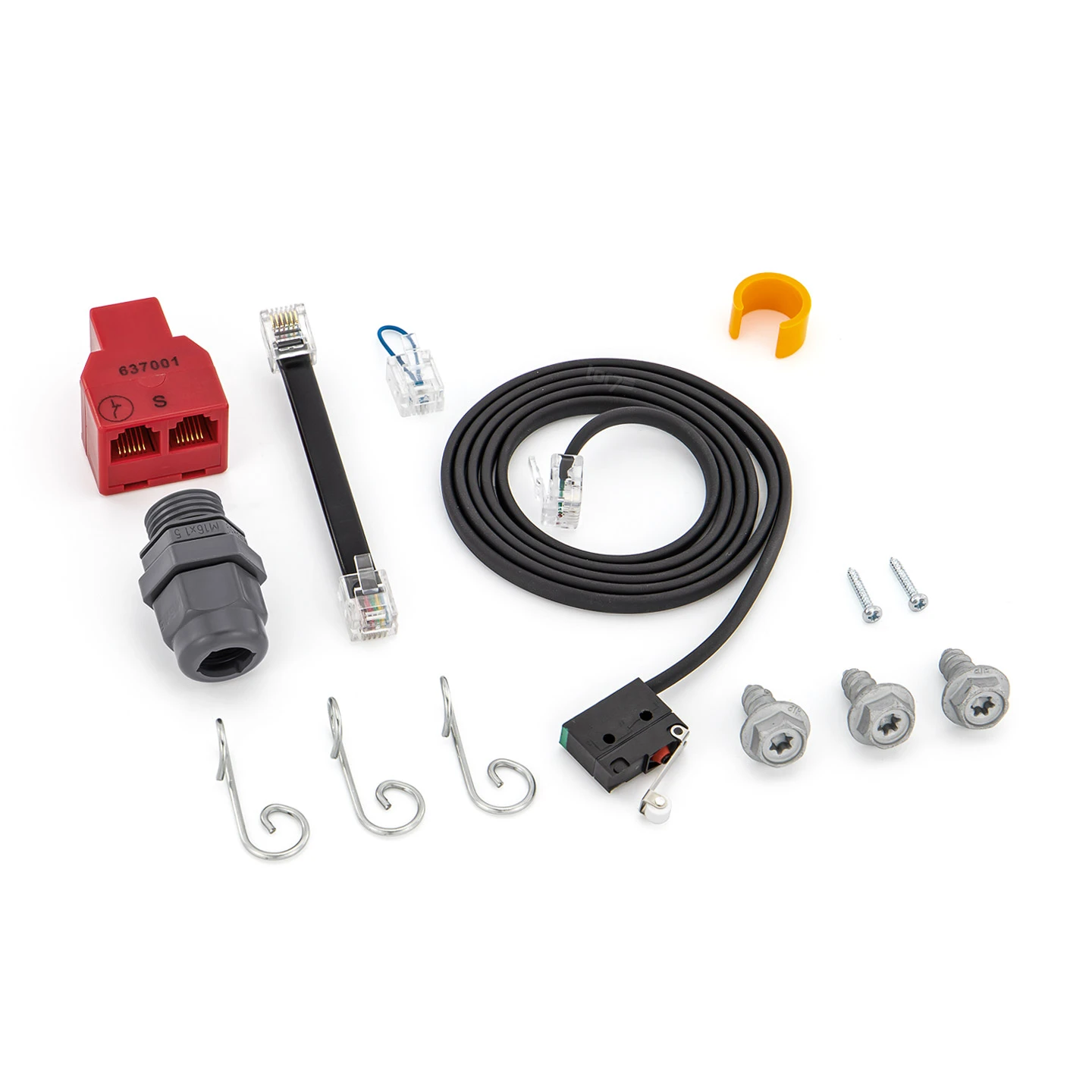 - Hörmann Nachtverriegelung, beinhaltet Riegelkontakt mit Systemleitung (Leitungslänge ca. 1m), Systemleitung (6-adrig, Länge ca. 10 cm), Befestigungsschrauben für Riegelkontakt, Verschraubung, Y-Stück mit Ruhestromkreis, Brückenstecker, Blechschrauben, Halterklammern, Montageanleitung